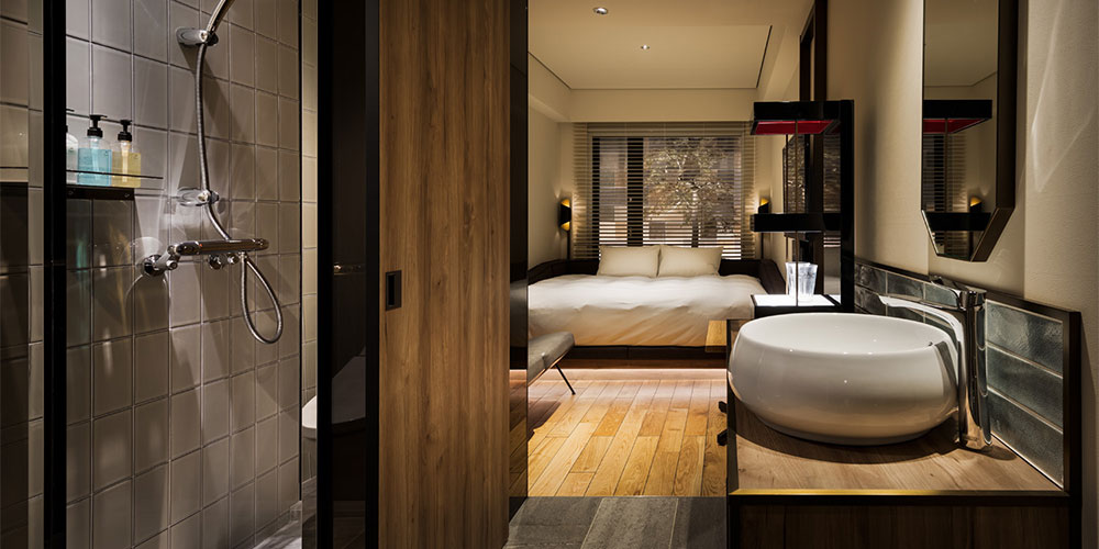 部屋に面したフロストガラスのシャワールームは行灯のようにひかり、柔らかい光の中でゆっくりお寛ぎいただけます。