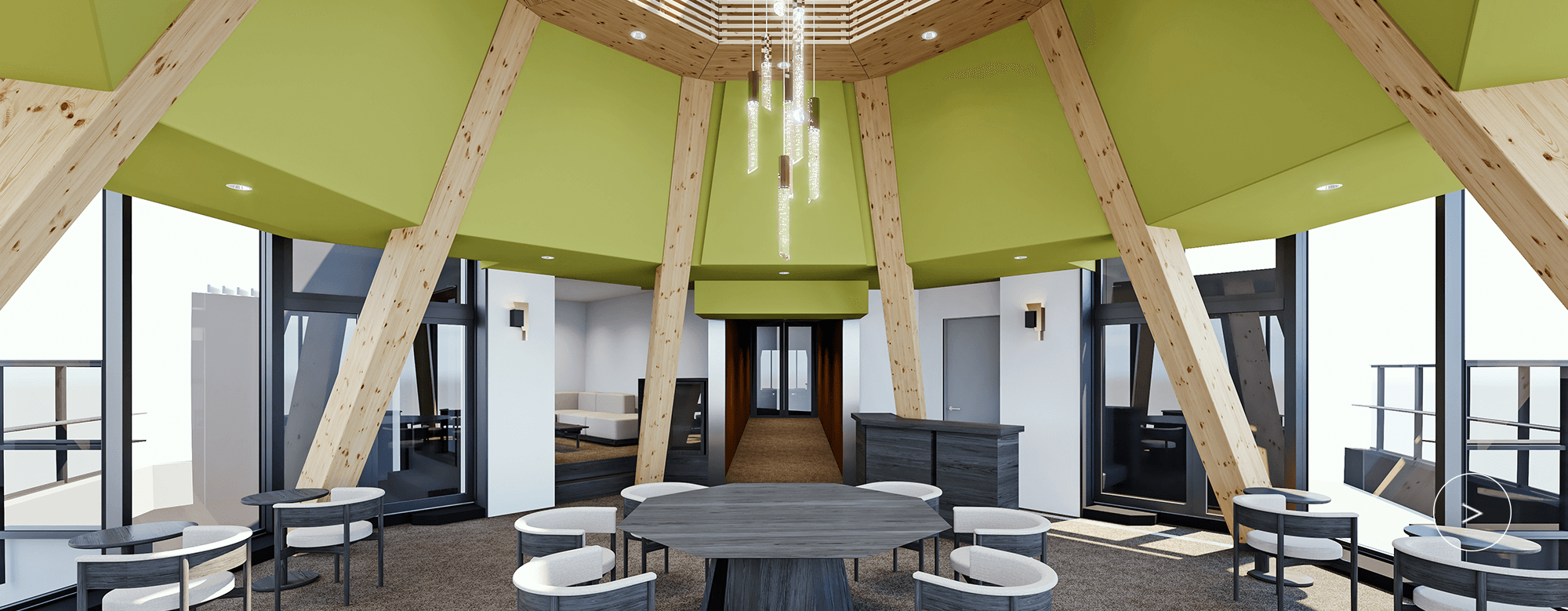 八角形を取り入れたデザインと温かみのある照明が、開放的で心地よい雰囲気を創造。