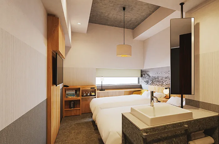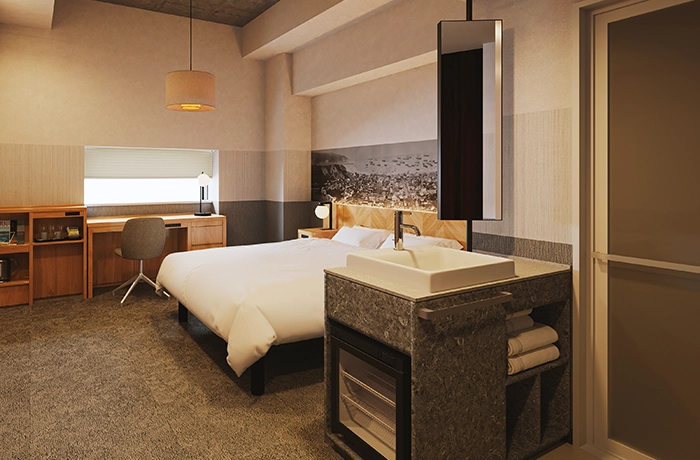 TV(インターネット利用可)/高速インターネット無料(Wi-Fi)/冷蔵庫/電気ケトル/電話機/金庫/ドライヤー/ハンガー/枕元コンセント/ウォシュレット付トイレ/ドリームベッド社製ベッド「Serta」/AIスマートスピーカー/個別空調